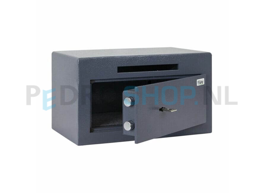 Deze afstortkluis van Filex biedt een eerste bescherming tegen inbraak en brand. Standaard wordt dit type uitgevoerd met een EN 1300 gecertificeerd dubbelbaard klavierslot met twee sleutels. Deze kluis kan zowel in de vloer als in de wand verankerd worden. Het verankeringsmateriaal wordt erbij geleverd. De afstortkluis wordt in het antraciet geleverd.