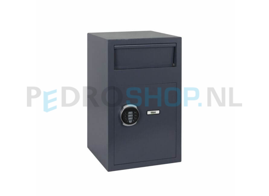 Deze afstortkluis van Filex biedt een eerste bescherming tegen inbraak en brand. Standaard wordt dit type uitgevoerd met een elektronisch slot (inclusief batterijen en noodsleutel). Deze kluis kan zowel in de vloer als in de wand verankerd worden. Het verankeringsmateriaal wordt erbij geleverd. De afstortkluis is voorzien van een afstortklep met anti-hengelvoorziening en wordt in de kleur antraciet geleverd. De afstortvoorziening kent een afmeting van 100x280x150 mm.
