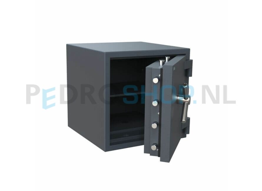 De Salvus Rome biedt een bescherming tegen brand en inbraak. De kluis is brandwerend gecertificeerd volgens EN 15659 LFS30P en inbraakwerend gecertificeerd volgens EN 1143-1 Grade III. Uitgevoerd met een elektronisch cijferslot en voorzien van 1 in hoogte verstelbaar legbord. Deze serie is voorbereid voor zowel vloer- als muurverankering en wordt geleverd in de kleur grafietgrijs RAL7024.