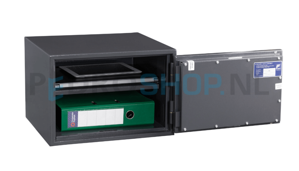 Deze serie van DRS is brandwerend getest en biedt een uitstekende inbraakwerendheid. Deze kluis wordt geproduceerd volgens EN14450 Security level 2 en ECB-S waardoor ze de perfecte keuze zijn voor zowel particuliere, als zakelijke toepassingen. De waardeberging is € 5.000 voor contant en € 9.000 voor kostbaarheden. Dit model K is voorzien van een dubbelbaardslot en één legbord. Voorbereid voor muur- en vloerverankering. Standaard wordt deze serie geleverd in de kleur antraciet RAL7016.