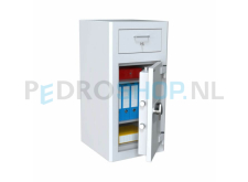 Deze afstortkluis biedt een bescherming tegen brand en inbraak. De kluis is brandwerendcertificeerd volgens DIN 4102 en is inbraakwerend gecertificeerd volgens EN 1143-1 Grade 1 (niet getest). Standaard uitgevoerd met een elektronisch cijferslot en een apart afsluitbare afstortlade met anti-hengelvoorziening. De kluis is voorbereid voor vloerverankering en is voorzien van 2 in hoogte verstelbare legborden. De afstortvoorziening kent de volgende afmetingen: 100x200x200 mm. Standaard geleverd in de kleur verkeersgrijs A RAL7042.