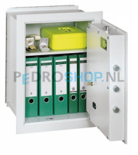 Deze inbraak- en brandwerende muurkluis van DRS biedt een eerste bescherming bij brand en een eerste bescherming tegen inbraak. Deze serie is geproduceerd volgens DIN 4102 en EN1143-1 klasse 1. De waardeberging is € 10.000 voor contant geld en € 20.000 voor kostbaarheden. Deze kluis is voorzien van een dubbelbaard sleutelslot en is bedoelt voor inbouw in de muur. Standaard wordt deze muurkluis geleverd met twee legborden in de kleur lichtgrijs.