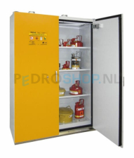 Een chemicaliënkast is noodzakelijk voor iedereen die werkt met gevaarlijke stoffen. Deze kast is getest volgens EN14470-1 type 90 (certificaat op aanvraag) en voldoet aan de PGS-richtlijn. De kastdeuren sluiten automatich bij brand als de temperatuur boven de 50°C komt. Luchtaanvoer- en afvoerkaneel sluit automatisch bij een temperatuur van 70°C. Voorzien van twee ventilatiekanalen met ingebouwde brandkleppen (DN80). Standaard geleverd met een cilindersleutelslot. Deze kast is voorzien van 3 legborden van gepoedercoat staal en een vloeistofdichte bodemopvangbak. Standaard geleverd in de kleur lichtgrijs RAL7035